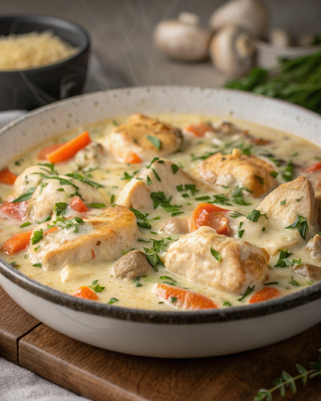 Je me rappelle ce matin d’automne, quand j’ai décidé de préparer une blanquette de poulet un peu à l’improviste. La cuisine embaumait déjà l’odeur douce du beurre chauffé, juste avant que les morceaux de poulet ne commencent à grésiller dans la casserole. J’aime ce moment-là, où les sons et les parfums s’entremêlent doucement, presque en silence. Le souffle de la vapeur qui s’élève, la texture tendre du blanc de poulet qui se délie sous la fourchette, et cette sauce crémeuse, veloutée, qui vient envelopper chaque ingrédient comme un petit manteau chaud. C’est une recette simple, qui réconforte sans lourdeur, et qui sait se préparer vite, quand la vie presse un peu. Rien de compliqué : juste le plaisir d’un plat maison, doux et sincère, à savourer dès la première bouchée.