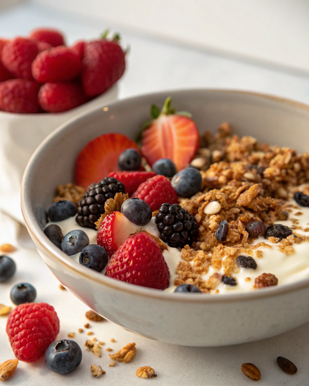 Ce bol s’invite avec simplicité sur une table en bois, la fraîcheur blanche du yaourt contraste naturellement avec les tons chauds du granola doré. Un petit nuage de fruits rouges apporte une touche vive qui éclaire le tout, tandis que les éclats croquants invitent la cuillère à un ballet de textures. Accompagné d’une tisane légère ou d’un café noir, ce moment devient doux et rassurant, parfait pour commencer la journée en douceur.