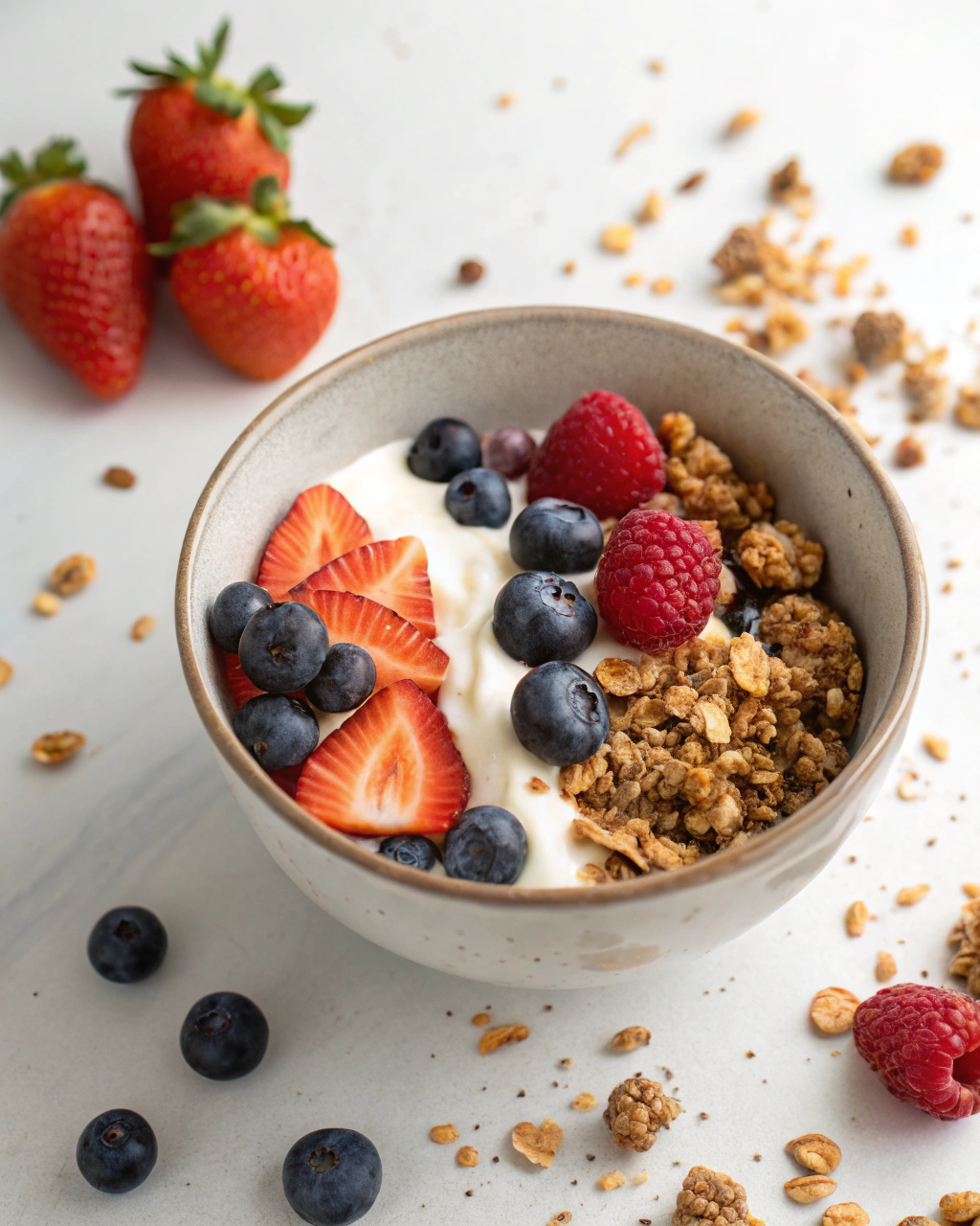 Servez ce bol de yaourt et granola dans des bols larges qui laissent voir toutes les textures, la fraîcheur douce du yaourt contraste joliment avec la teinte dorée du granola. Ajoutez quelques fruits colorés sur le dessus pour une touche vive et naturelle, comme des quartiers de pomme croquante ou une poignée de myrtilles. Poser le bol sur une table en bois, au calme du matin, invite à prendre le temps, à savourer chaque cuillerée avec douceur.