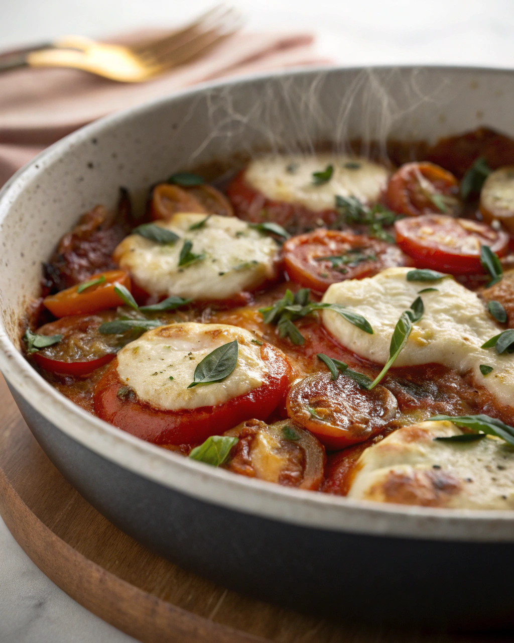 Servez ces bouchées sur un joli plateau en bois, leur couleur rouge vif et leur vert éclatant formant un tableau chaleureux. Elles sont parfaites pour une petite réunion entre amis, accompagnées d’un verre de vin blanc frais ou d’une limonade maison. L’idéal est de les déguster encore tièdes, quand la mozzarella s’étire légèrement sous la dent et que le basilic dégage toute sa fraîcheur. Un bouquet de feuilles fraîches à côté invite à se resservir, dans une ambiance simple et authentique.