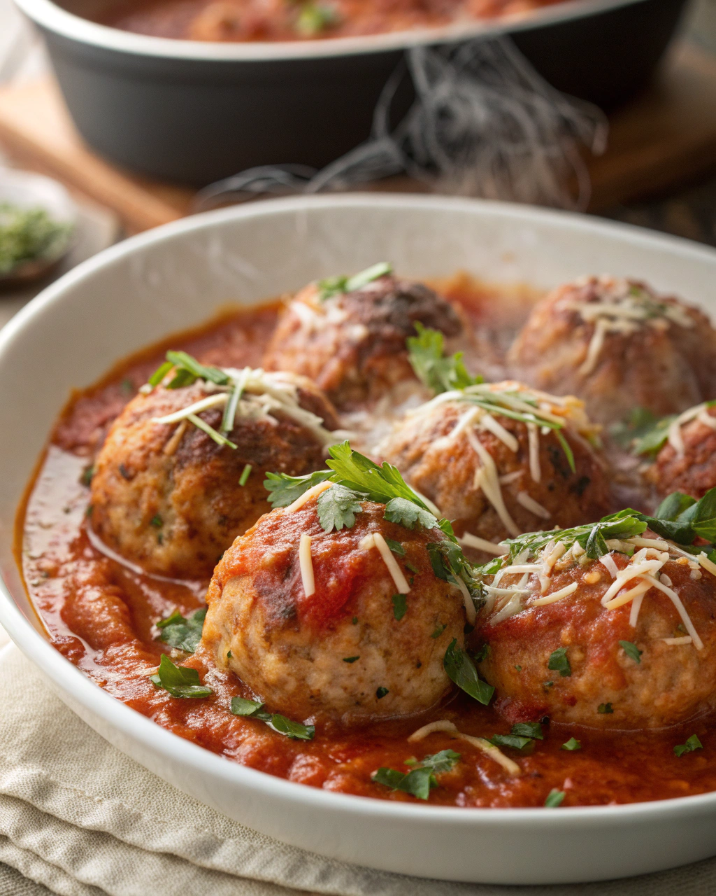 Déposez les boulettes encore chaudes dans un plat creux ou une assiette colorée, nappez-les généreusement de sauce tomate où flottent les éclats de basilic. Cette palette rouge et verte réchauffe l’œil, invite à poser la fourchette avec plaisir. Un lit de riz blanc ou une salade d’épinards frais accompagnera à merveille ces petites billes de douceur. L’ensemble donne une ambiance simple, presque familiale, où la cuisine sent bon l’authenticité et la générosité.