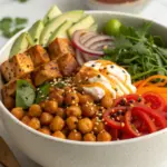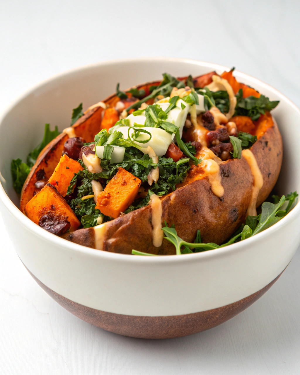 Servez ce bowl au creux d’un joli bol large, pour admirer les contrastes de couleurs entre l’orange vif de la patate douce, le vert profond de l’avocat et les petites graines dorées. Posez-le sur une nappe légère, accompagnez-le d’une tisane chaude ou d’un verre d’eau citronnée pour prolonger cette ambiance douce. Le mélange de textures entre le fondant, le croquant et le moelleux invite à manger lentement, en savourant chaque bouchée. C’est un plat qui appelle à la simplicité mais aussi à un moment de calme bien mérité.