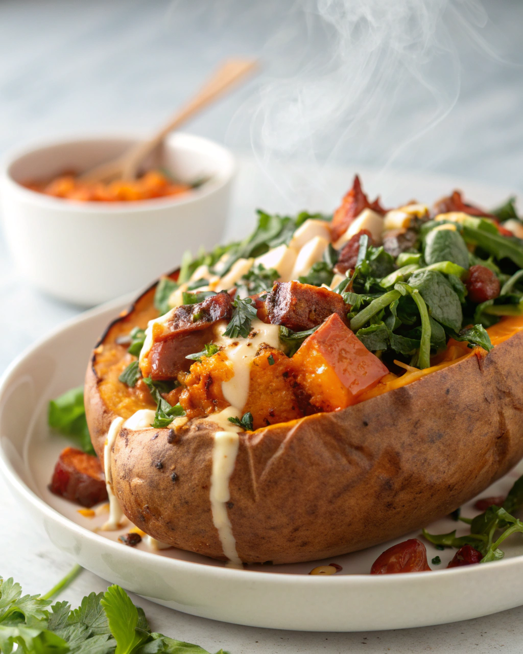 Servez ce bowl dans un grand bol coloré pour faire ressortir les couleurs chaudes de la patate douce et le vert tendre des épinards et de l’avocat. Le contraste entre la douceur rôtie et la fraîcheur acidulée du citron invite à une dégustation lente, presque méditative. Accompagnez-le d’un thé vert léger ou d’une eau citronnée pour rester dans cette simplicité spontanée. Son équilibre entre textures moelleuses, croquantes et fraîches donne envie de s’attarder à la table, sans précipitation.