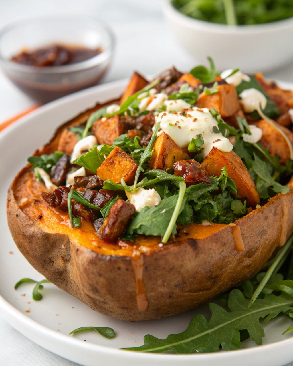 Servez ce bowl dans de larges assiettes creuses ou dans des bols aux couleurs naturelles, qui mettent en valeur les teintes orangées de la patate douce et le vert tendre de l’avocat et des épinards. Une ambiance douce, presque méditerranéenne, s’installe autour de cette assiette généreuse, idéale pour un déjeuner simple mais complet. Vous pouvez accompagner ce plat d’un yaourt nature ou d’une sauce au tahini pour apporter une touche crémeuse au repas.