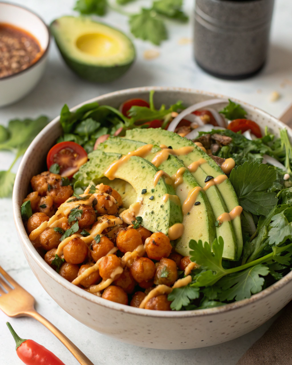 Je me souviens encore de cette après-midi où, après un marché animé sous un ciel un peu voilé, j’ai concocté ce bowl plein de fraîcheur. Le parfum légèrement grillé des pois chiches qui rôtissent doucement au four emplit la cuisine, ce petit craquement sous ma fourchette quand je goûte la texture fondante de l’avocat mûr à point, mêlé au croquant des légumes frais. Il y a cette lumière douce qui passe à travers la fenêtre, juste assez pour révéler les couleurs vives du plat. J’aime particulièrement ce moment où tout s’assemble, où je sens que la simplicité des ingrédients, juste assaisonnés comme il faut, crée une harmonie pleine de caractère et de douceur. Ce bowl, c’est un souvenir de repas sans chichis, nourrissant et apaisant, parfait pour une pause où le temps semble un peu ralentir.