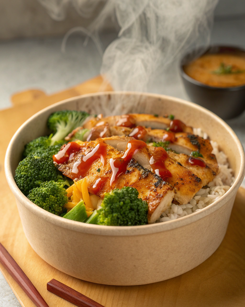 Servez ce bowl dans un récipient large et pas trop profond pour que tous les ingrédients restent bien visibles. Le vert vif du brocoli contraste joliment avec le blanc doré du riz et le poulet légèrement caramélisé donne envie d’y plonger la cuillère. Quelques feuilles de coriandre fraîches déposées par-dessus offrent une touche de fraîcheur finale. Cette simplicité colorée invite à un repas tranquille, léger mais satisfaisant, que l’on peut accompagner d’un verre d’eau infusée au citron ou d’un thé léger.