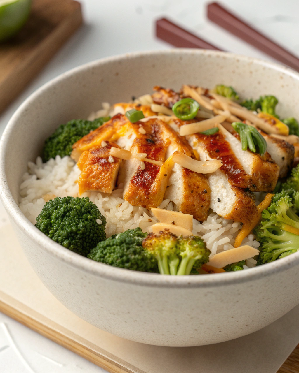 Servez ce bowl dans un bol large, qui encourage à mélanger toutes les saveurs du poulet tendre, du riz légèrement moelleux et du brocoli croquant. Le contraste visuel entre le vert éclatant et le doré du poulet apporte une belle harmonie naturelle. Pour un repas complet, accompagnez d’une petite salade fraîche ou d’une soupe légère, selon la saison. L’idée est de profiter d’un plat simple mais plein de vie, à déguster dans une ambiance tranquille, entre pauses et douceur.