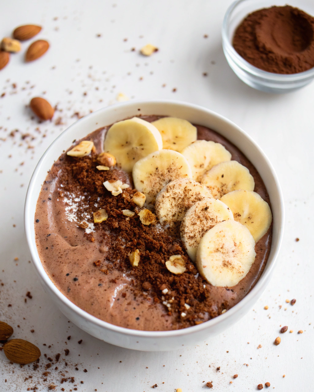 Servez ce bowl dans un joli bol aux couleurs douces, où le brun du cacao contraste avec le beige clair de la banane. Disposez quelques noisettes éclatées en petites touches, comme une caresse croquante. Posez-le sur une table en bois, accompagné d’une cuillère simple, en profitant de la lumière douce du soir. Cette recette se marie particulièrement bien avec une infusion au thym ou une tisane légère, apportant paix et plaisir dans une atmosphère calme.