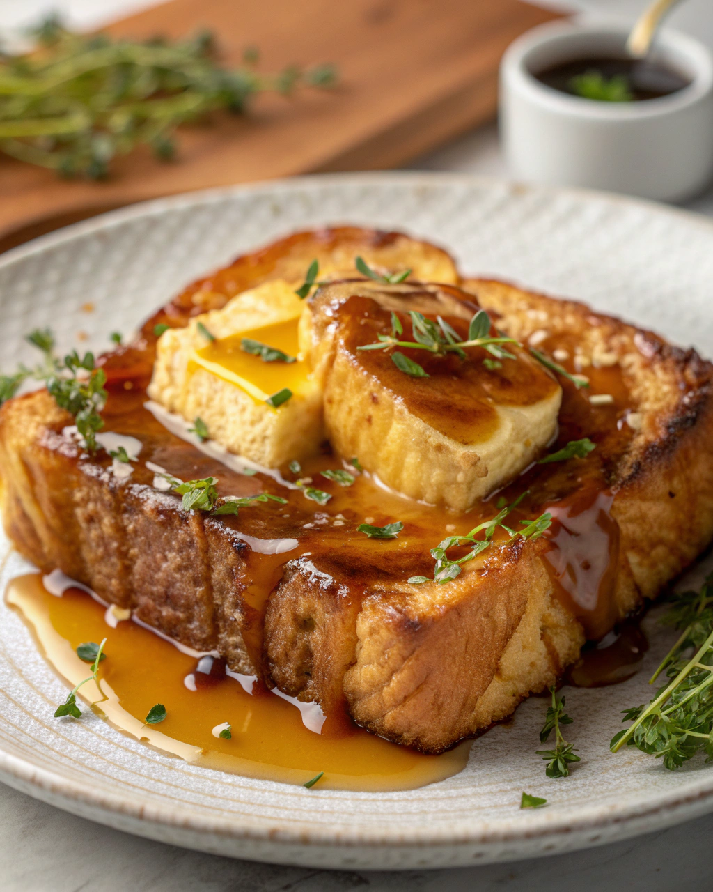 Servez la brioche perdue chaude, juste dorée, posée sur une jolie assiette blanche ou en terre cuite, pour laisser briller ses couleurs caramel. Quelques fruits rouges ou une compotée maison apportent une note fraîche et colorée. Un filet de sirop d’érable ou un peu de crème fouettée légérement sucrée complète ce tableau simple et doux, parfait pour prendre le temps de savourer un dimanche matin, sans hâte ni prétention.