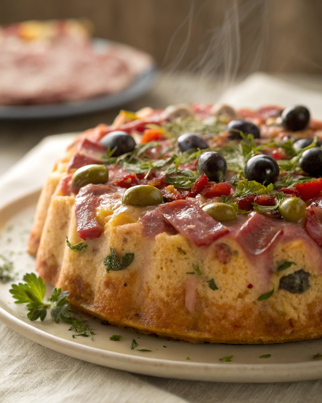 Je me souviens encore de ce moment précis où le cake sortait du four, enveloppant toute la cuisine d’un parfum chaleureux et légèrement épicé. La croûte dorée, juste assez croustillante, cédait la place à une mie moelleuse, dense, presque tendre au toucher. Il y avait ce petit “pop” discret, signe que l’humidité s’échappait doucement, tandis que les arômes du jambon fondaient avec ceux des olives, ce mélange si simple mais réconfortant à la fois. J’adorais ce silence suspendu, juste avant de couper la première tranche, entendre la mie qui se dérobe sous le couteau, promettant une texture parfaite, au goût équilibré, ni trop sec ni trop gras. C’est une recette qui m’accompagne depuis des après-midis où l’on se retrouve sans façon, simplement pour partager un moment convivial autour d’un plat qui invite à savourer lentement.