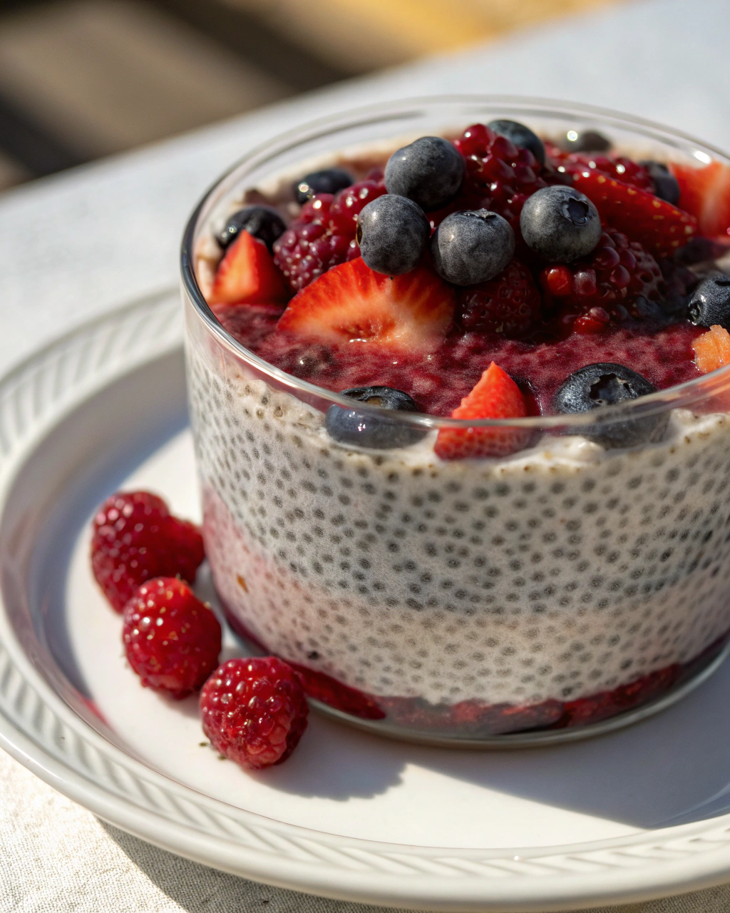 Servez votre chia pudding dans un joli verre transparent, pour laisser voir les petites graines en suspension. Quelques fruits rouges ou tranches fines de kiwi déposés dessus ajoutent une touche de couleur et de fraîcheur. Un filet de miel ou une pincée de cannelle peut venir sublimer discrètement l’ensemble. À table, installez-vous près d’une fenêtre pour profiter du matin tout doux, la lumière qui décroît sur la poudre blanche donne alors à ce moment une simplicité presque douce à savourer.
