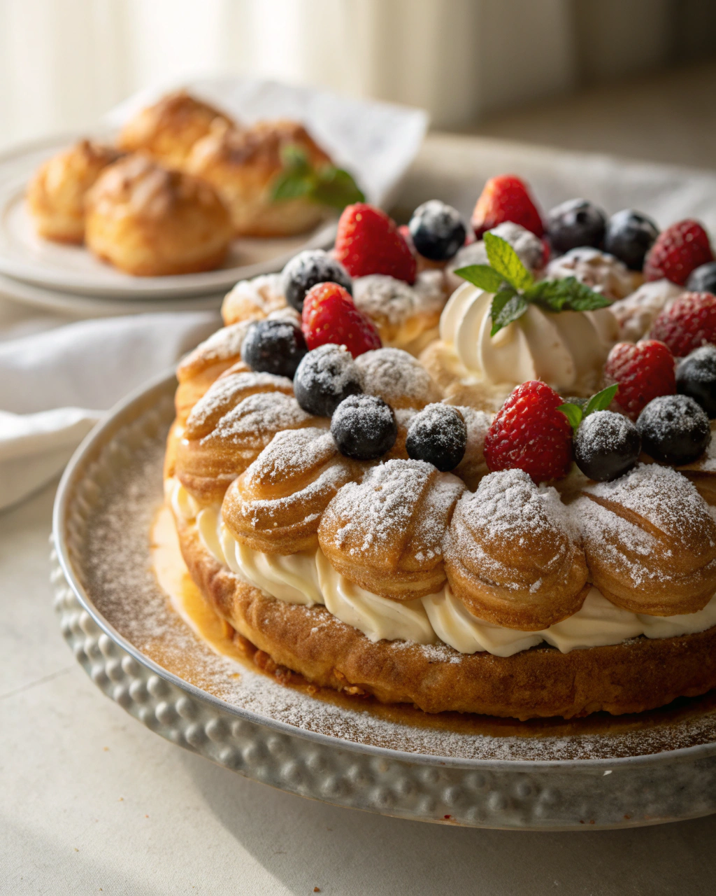 Posez les choux sur une jolie assiette claire pour mettre en valeur leur teinte dorée, en les espaçant avec légèreté. L’éclat délicat de la crème, visible à travers une ouverture subtile, invite à la découverte. Imaginez-les autour d’un café ou d’un thé, dans une ambiance douce et détendue, avec un linge en lin naturel pour rappeler la simplicité de ce dessert. Un petit fruit rouge de saison ou une feuille de menthe fraîche posée à côté sera un joli clin d’œil à la fraîcheur de la garniture.