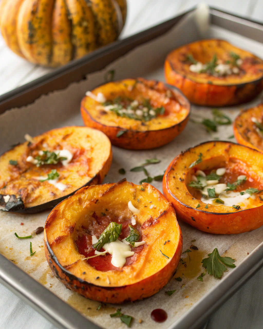 Cette courge rôtie, avec sa teinte chaude entre l’orange doux et le doré, s’invite naturellement sur une assiette aux tons neutres, laissant sa couleur parler d’elle-même. Serve-la avec une salade verte légèrement acidulée ou du quinoa pour un repas léger. La douceur de la courge se marie aussi bien avec un filet d’huile de noix que quelques herbes fraîches ciselées, comme du persil ou de la coriandre. C’est un plat qui invite à la simplicité, posé au centre de la table, pour partager sans chichis.
