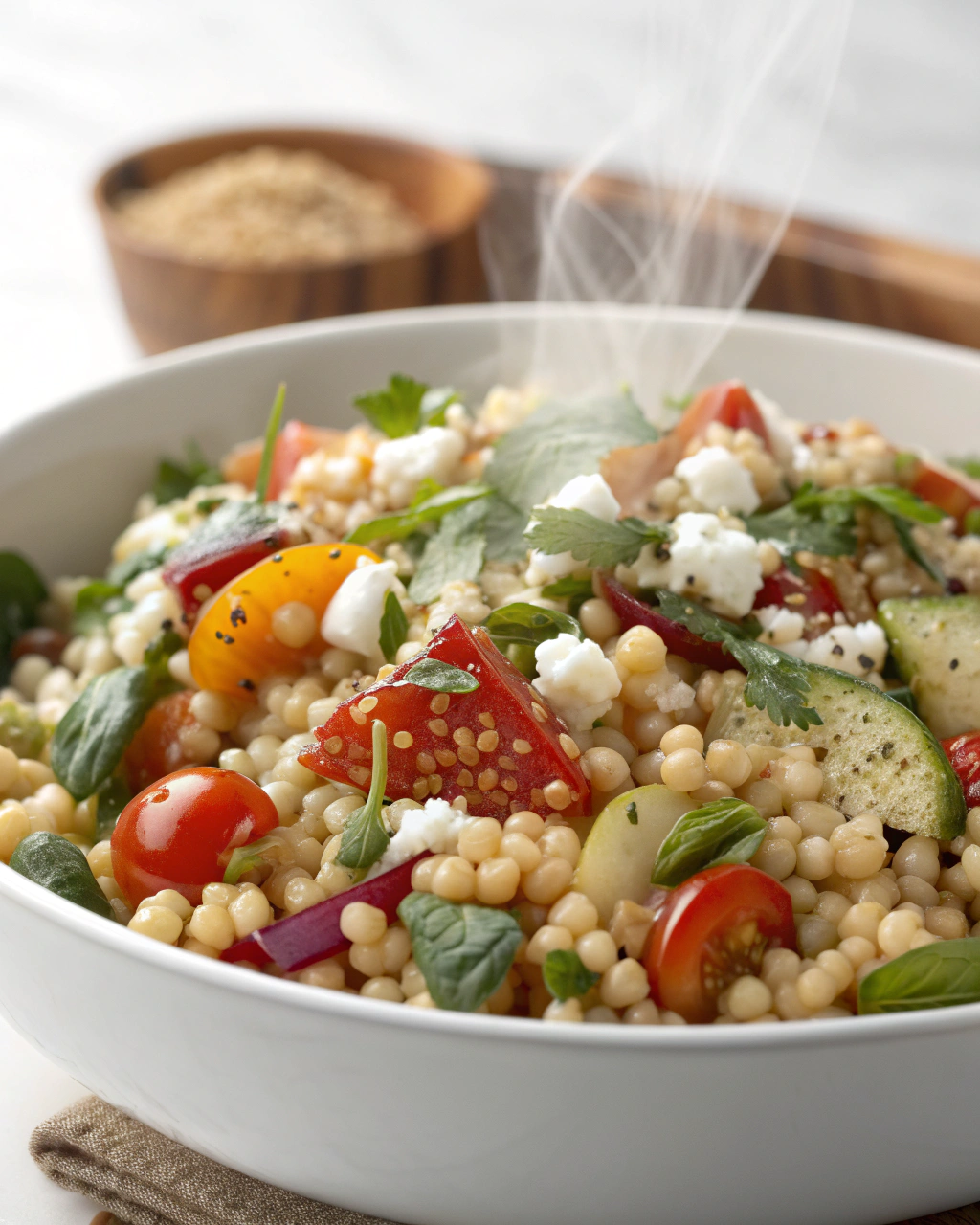 Servez ce couscous perlé dans des assiettes creuses, en laissant apparaître les couleurs vibrantes des légumes. Un petit filet d’huile d’olive fraîchement pressée sur le dessus apportera encore plus de rondeur au plat. Accompagnez-le d’un yaourt nature ou d’une sauce au citron pour contraster la douceur. Ce plat invite à se poser, partager un repas simple, autour d’une table éclairée par la lumière douce d’une fin d’après-midi.