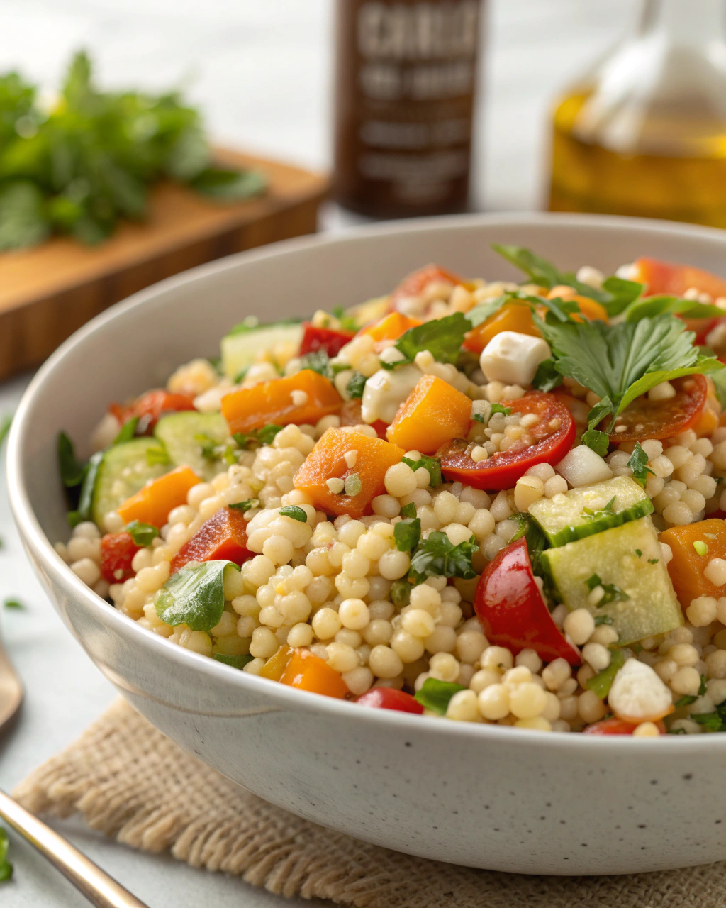 Servez ce couscous perlé aux légumes dans de larges assiettes creuses pour que la chaleur s’échappe lentement, invitant chacun à savourer la texture moelleuse enrichie de petits éclats croquants. La couleur chaleureuse des épices et des légumes donne une belle profondeur visuelle, facile à accompagner d’une salade verte ou d’un yaourt nature légèrement citronné. Pour prolonger la douceur, un verre de thé à la menthe fumé au coin de la table rendra ce moment encore plus apaisant.