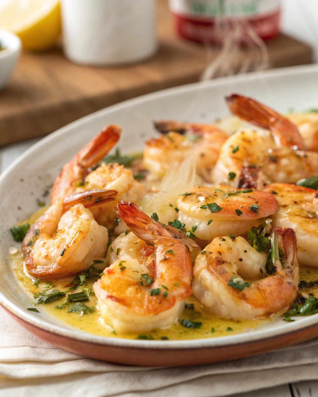 Servez ces crevettes encore chaudes, dans une assiette blanche qui fera ressortir les couleurs vives du citron et du persil. La simplicité du plat invite à une ambiance détendue, idéale pour un repas léger en soirée. Accompagnez-les d’un filet d’huile d’olive crue sur le dessus et proposez une tranche de citron à côté, pour ceux qui aiment l’acidité plus prononcée. Le mélange de textures – la peau fondante des crevettes, la douceur du beurre et le croquant léger de l’ail – crée une harmonie discrète, sans artifices, qui parle de moments partagés sans chichi.