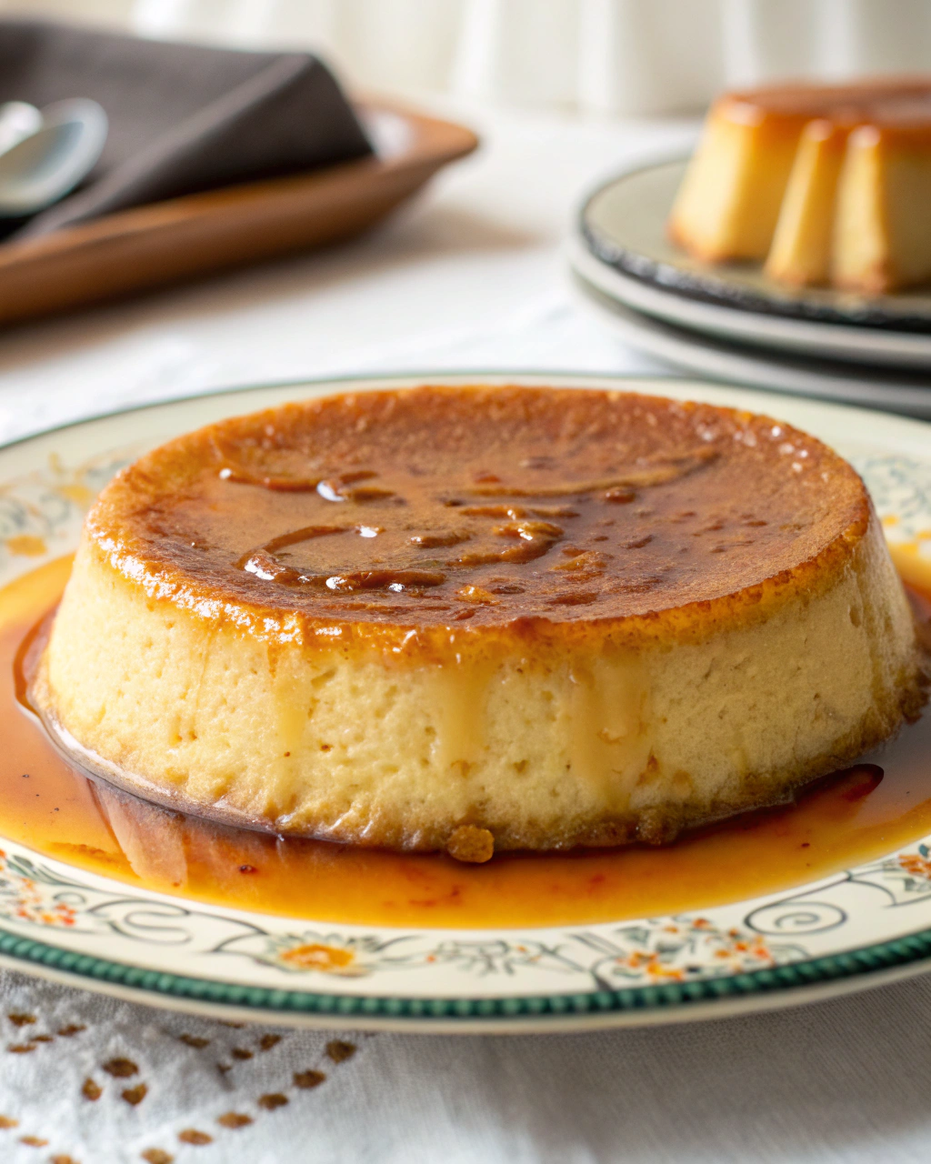 Servez ce flan pâtissier simplement, accompagné d’une tasse de thé noir ou d’un café léger qui réveille sans étouffer. La couleur dorée de la croûte contraste joliment avec la crème ivoire, apportant une douceur visuelle. N’hésitez pas à parsemer un peu de sucre glace ou à disposer quelques fruits rouges frais à côté pour apporter une touche de fraîcheur et de couleur. Il s’invite sans prétention, parfait pour un goûter au calme, posé sur une table en bois, avec la lumière douce de fin d’après-midi.