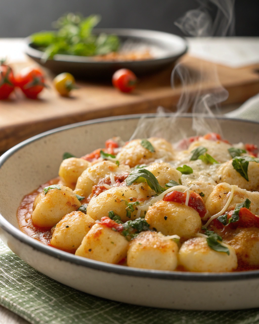 Servez ces gnocchis dorés dans une assiette simple, en les parsemant d’un peu de parmesan fumé, pour jouer sur le contraste des couleurs. La douceur dorée des gnocchis se marie joliment avec des feuilles de roquette fraîches ou une rosette de jambon cru déposée à côté. C’est un plat qui appelle des moments partagés, à la lumière tamisée, avec une pointe de pain croustillant pour accompagner chaque bouchée.