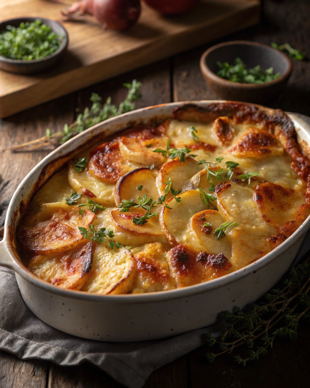 Servez ce gratin dans le plat de cuisson pour garder toute sa chaleur et inviter à partager. Les tons dorés du dessus contrastent joliment avec la douceur nacrée des pommes de terre fondantes à l’intérieur. Ce plat s’accorde parfaitement avec une salade simple, verte et croquante, ou des légumes verts vapeur, apportant fraîcheur et légèreté. Sur une table décontractée, il crée instantanément une ambiance douce, comme une pause réconfort au milieu d’un jour chargé.