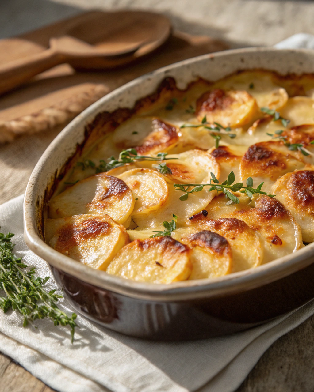 La vision d’un gratin doré à souhait qui s’étale doucement dans un plat rustique invite à une douce convivialité. Servez-le encore chaud, accompagné d’une salade verte légèrement acidulée pour relever la douceur des pommes de terre. La couleur crème du gratin contraste joliment avec le vert vif des feuilles, tandis que la petite croûte dorée rappelle l’enfance et les repas partagés en famille. Ce plat garde une simplicité qui réchauffe sans détour, parfait en toute saison.