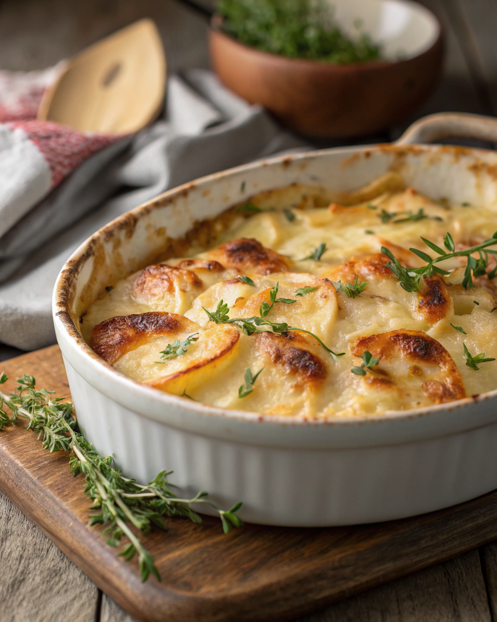 • Ajouter un peu de thym frais ou de romarin sur le dessus avant la cuisson ajoutera un parfum d’herbes qui se marie très bien avec la douceur du gratin.