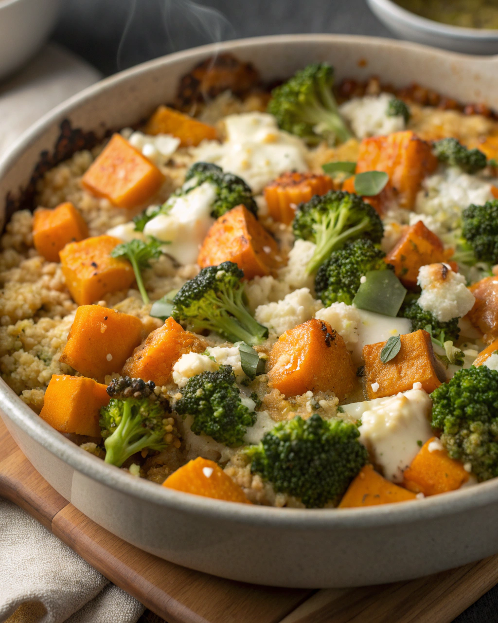 Ce gratin dégage une chaleur réconfortante où la douceur du butternut rencontre la fraîcheur légèrement croquante du brocoli. La feta apporte une touche salée et parfumée, tandis que le quinoa offre une base fondante qui lie l’ensemble. Un plat complet, savoureux et parfaitement équilibré.