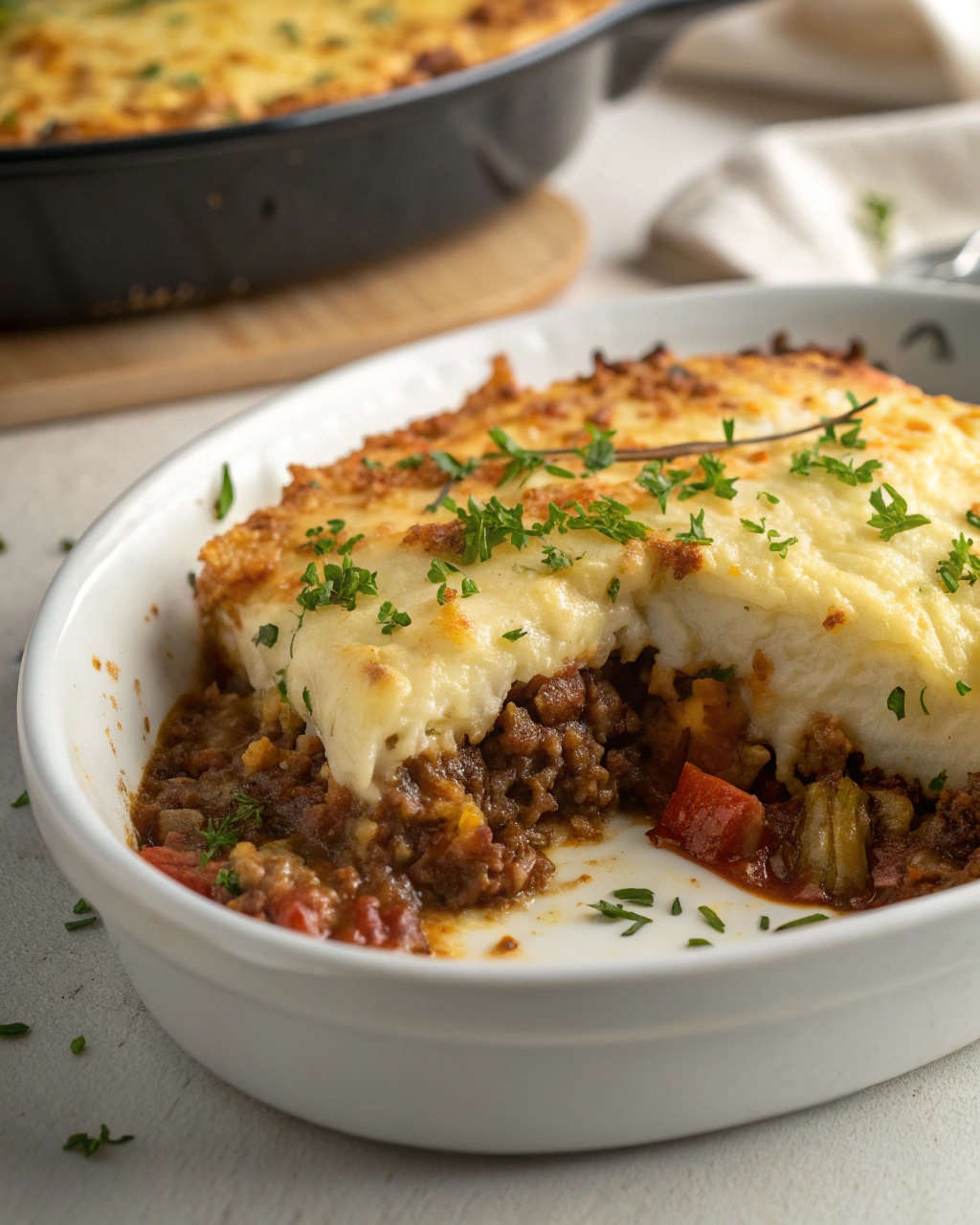 Servez ce hachis parmentier dans des assiettes creuses pour garder toute sa chaleur et sa texture moelleuse. Le contraste doré de la purée invite à creuser doucement, et la viande révèle un goût chaleureux, presque réconfortant. Il se marie bien avec une salade verte légèrement vinaigrée, ou quelques légumes de saison juste sautés pour apporter un peu de fraîcheur et de croquant. Une ambiance simple à la maison, comme un moment où l’on prend soin de soi.