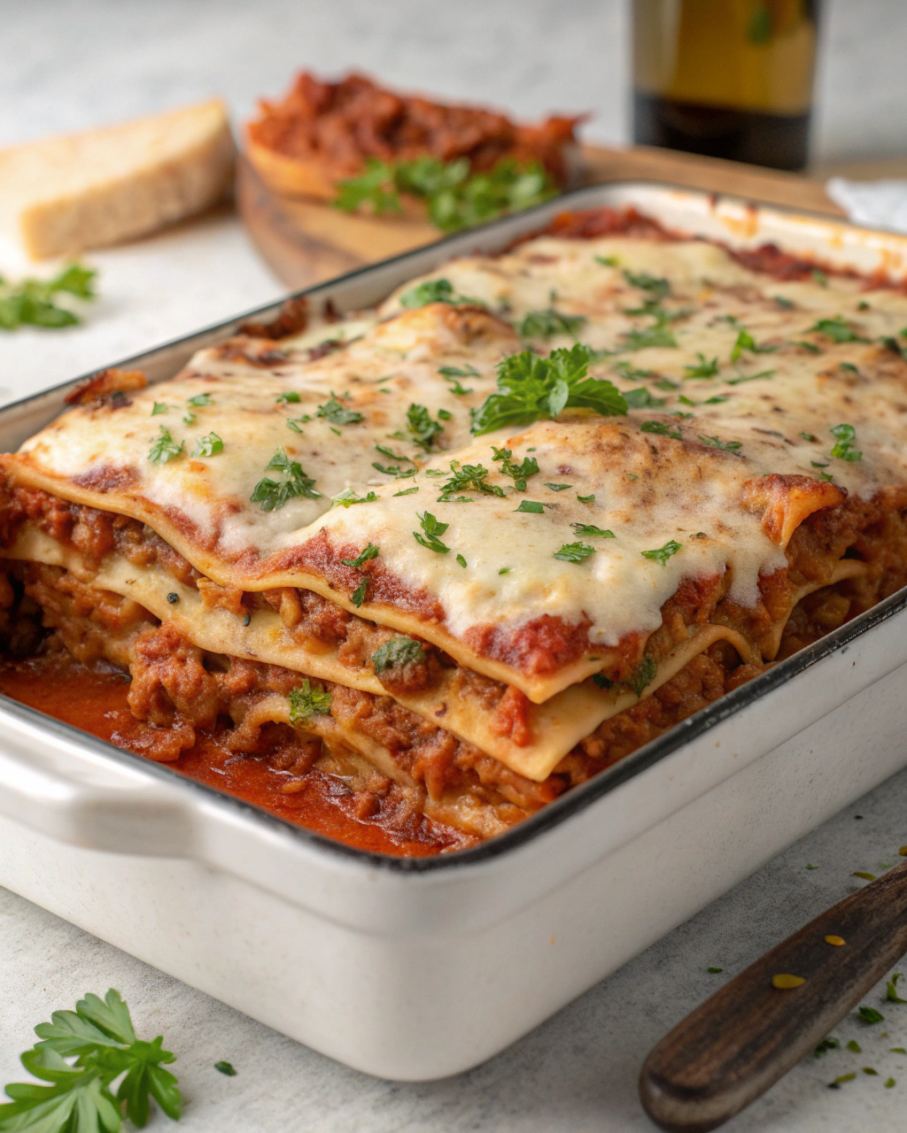Servez ces lasagnes dans des assiettes creuses pour garder les sucs bien au chaud. La couleur rouge de la sauce contrastée par le blanc doré du fromage donne immédiatement envie de se poser à table. C’est un plat qui appelle la simplicité, avec une salade verte poivrée ou quelques légumes rôtis pour équilibrer la générosité du gratin. Les saveurs s’expriment pleinement à chaque bouchée, accompagnées d’un verre de vin léger ou d’une eau pétillante, selon l’ambiance du moment.