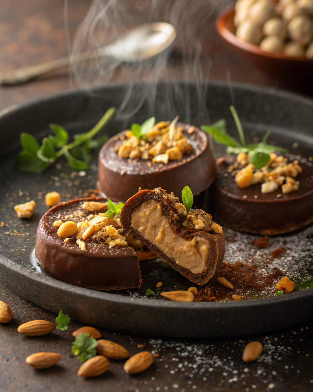 Ces médaillons chocolat–cacahuètes sont l’une de ces gourmandises simples qui font toujours plaisir. Le chocolat fondant mêlé au croquant des cacahuètes torréfiées offre une combinaison irrésistible, à la fois douce, parfumée et légèrement grillée.