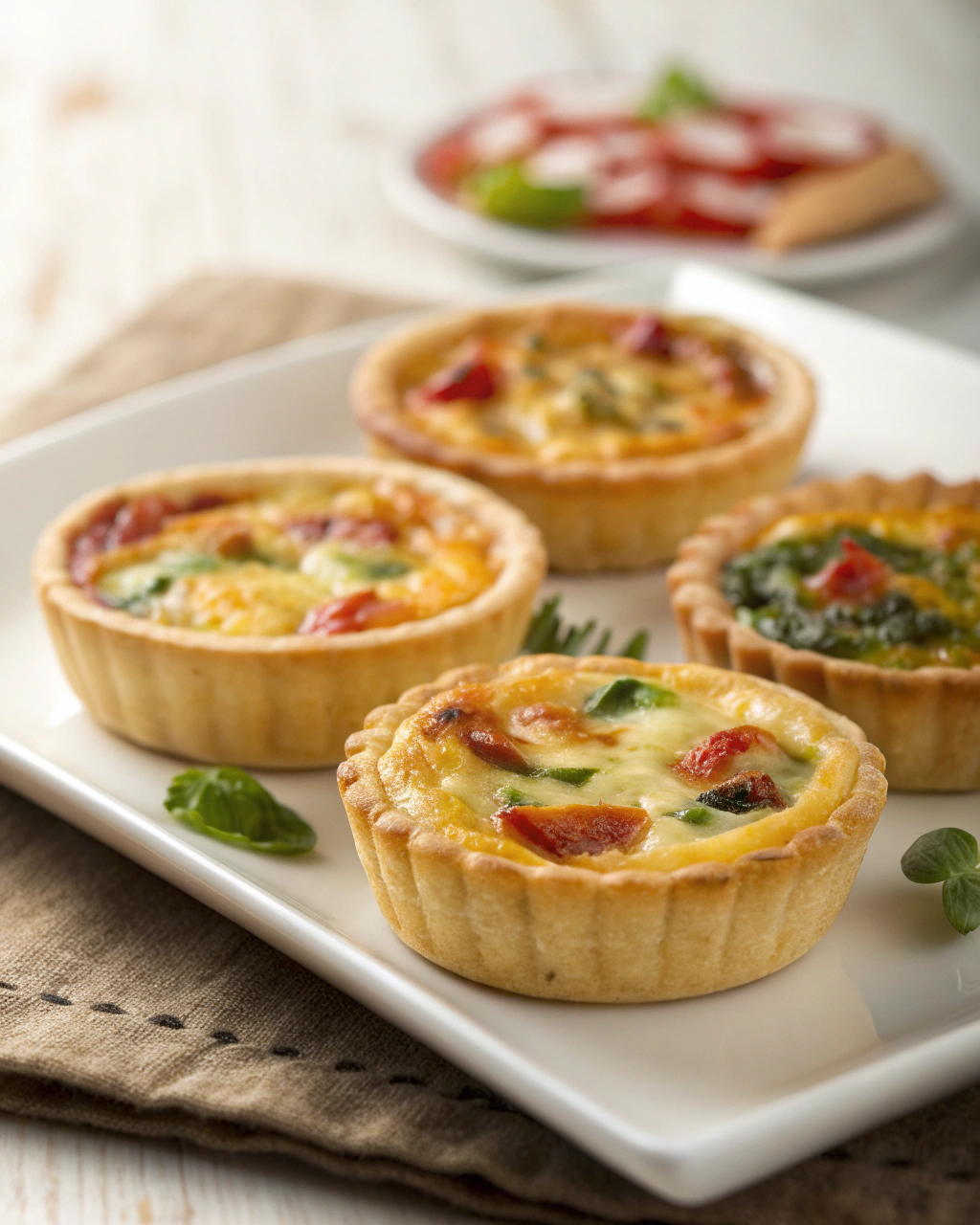 Ces mini quiches se posent avec naturel sur une assiette colorée, accompagnées d’une salade aux fines herbes ou d’un mesclun légèrement vinaigré. Leur teinte dorée tranche joliment avec le vert tendre des feuilles, invitant à un repas simple et léger. Elles sont parfaites à partager en début de soirée, plongées dans la lumière douce d’un après-midi d’automne, et se marient bien avec un verre de vin blanc sec ou une tisane parfumée selon l’ambiance.