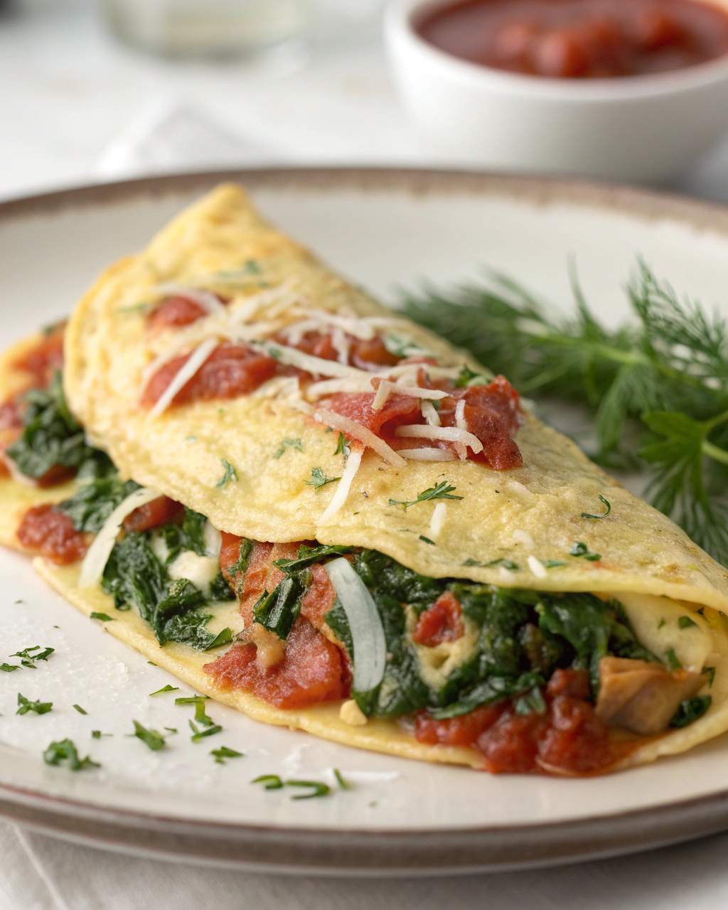 Servez cette omelette sur une assiette aux tons naturels, accompagnée d’une salade légère — peut-être un mélange de jeunes pousses avec un filet de citron. Le vert profond des épinards apporte une fraîcheur simple qui s’accorde joliment avec un pain rustique encore tiède. C’est un repas d’hiver doux, mais aussi assez lumineux pour une soirée d’été où l’on cherche la simplicité. Ajouter quelques fines herbes fraîches dessus finit cette histoire de couleur et de parfum dans l’assiette.