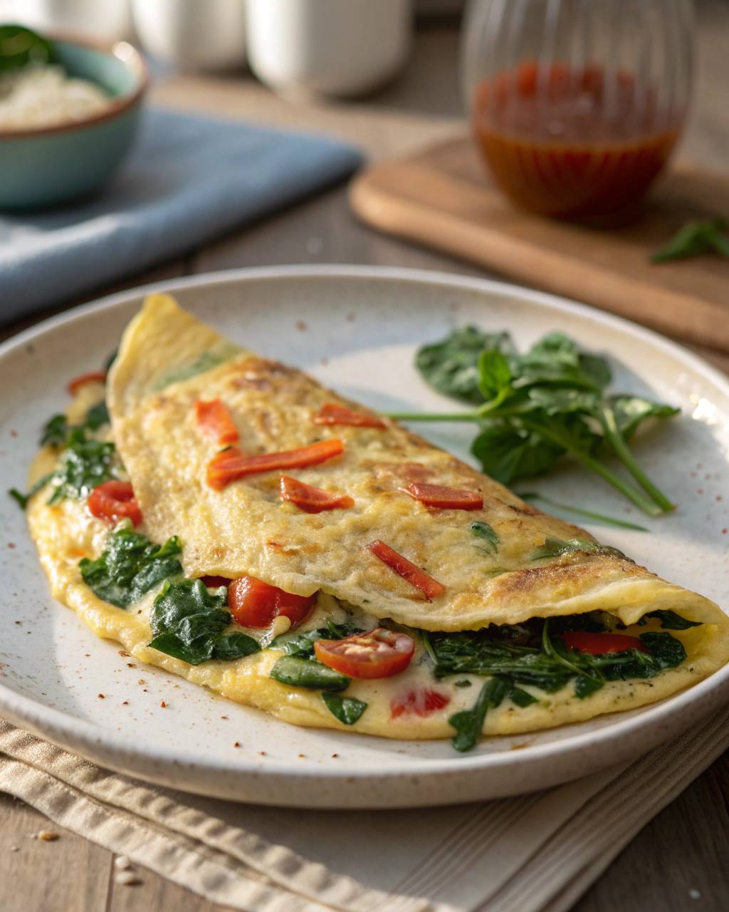 Servez votre omelette tiède, posée délicatement sur une assiette lumineuse où le vert des épinards tranche harmonieusement avec le jaune doré des œufs. J’aime l’accompagner d’une salade fraîche, avec des tomates cerises éclatantes et quelques fines tranches de radis, pour un contraste entre le chaud moelleux et le croquant vif. Une tranche de pain de campagne grillé, encore un peu croustillante, finit toujours bien le tableau. L’ensemble invite à s’installer sans hâte, à prendre le temps de savourer chaque bouchée.