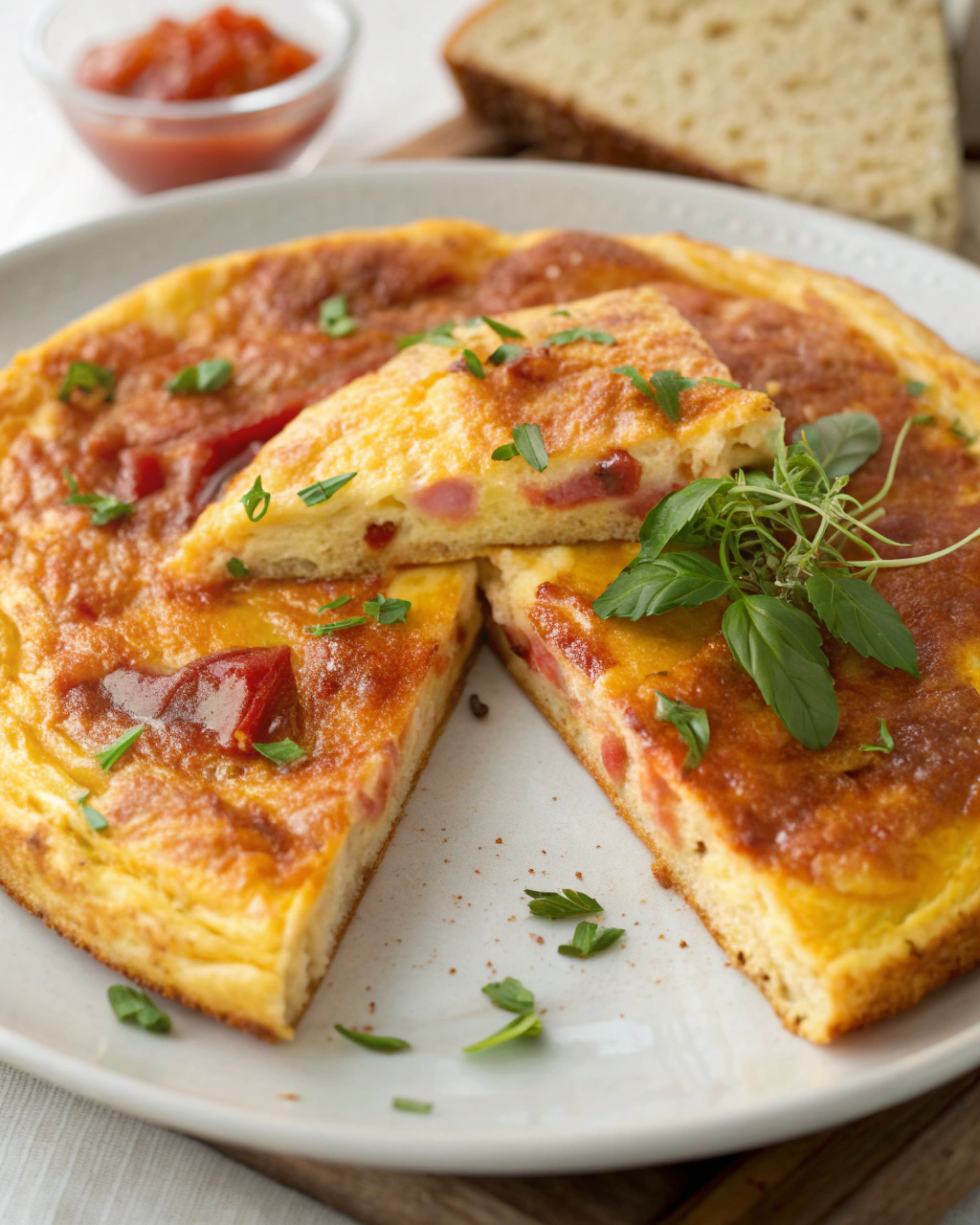 Servez cette omelette dans une assiette simple, de préférence claire, où sa teinte dorée ressortira avec délicatesse. La ciboulette fraîche vient parsemer élégamment la surface, apportant une note de verdure qui invite à la fraîcheur du matin. Accompagnez-la d’une tranche de pain de campagne légèrement grillée ou d’une petite salade verte, pour une touche de légèreté. C’est le genre de plat qui se savoure tranquillement, avec la lumière douce d’un début de journée, où chaque bouchée rappelle la simplicité et le plaisir de cuisiner à la maison.
