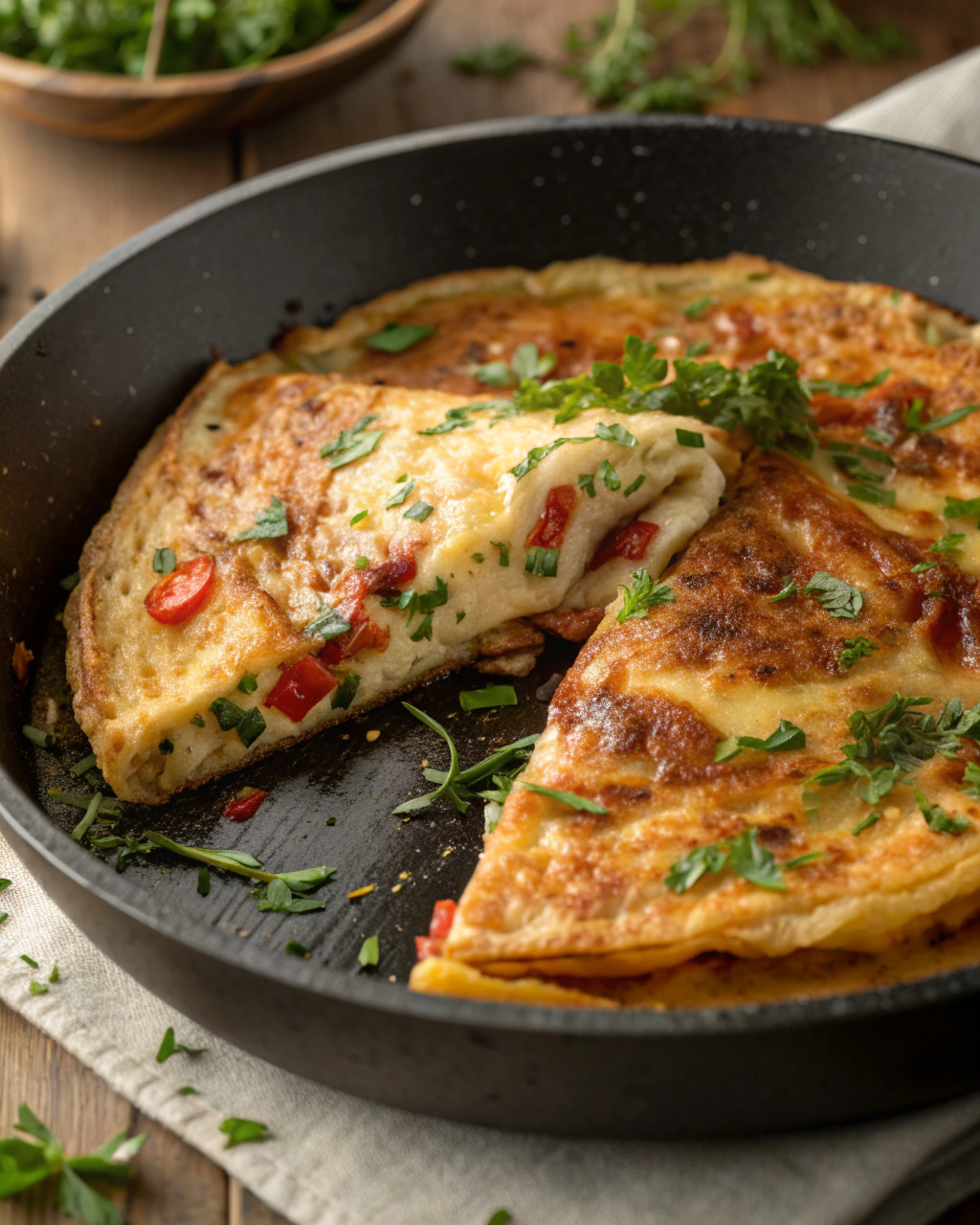 Servez cette omelette moelleuse accompagnée d’une tranche de pain de campagne légèrement grillé, encore tiède, pour jouer sur la douceur et le croustillant. Un petit bol de salade verte, avec un filet de vinaigre balsamique, ajoute une touche de fraîcheur bienvenue. La lumière douce d’un matin calme, une tasse de café fumante à côté, complètent le tableau d’un repas simple et sincère, qui rassure sans prétention.
