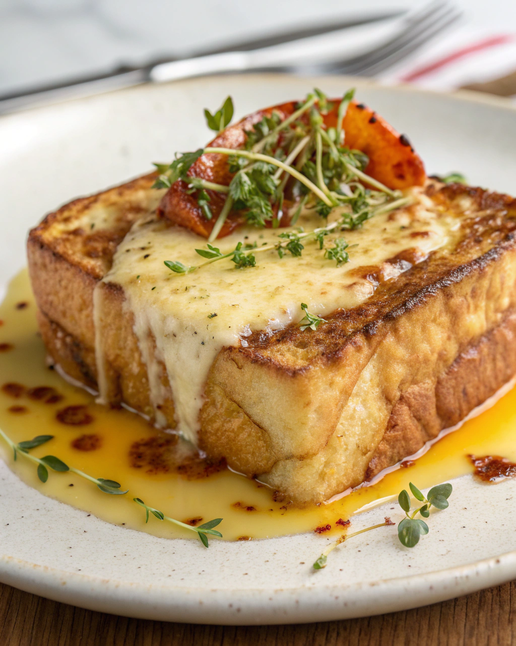 Pose délicatement chaque tranche dorée sur une assiette légèrement chaude, laisse le sucre glace scintiller doucement sur le dessus. Le pain perdu s’accorde à merveille avec des fruits rouge vif — framboises, myrtilles, ou quelques tranches de pomme — qui apportent fraîcheur et croquant. Un filet de sirop d’érable ou un peu de confiture maison complète l’ensemble sans lourdeur. La simplicité de cette assiette invite à une pause douce, idéale pour se retrouver autour d’un café ou d’un thé fumant en matinée.