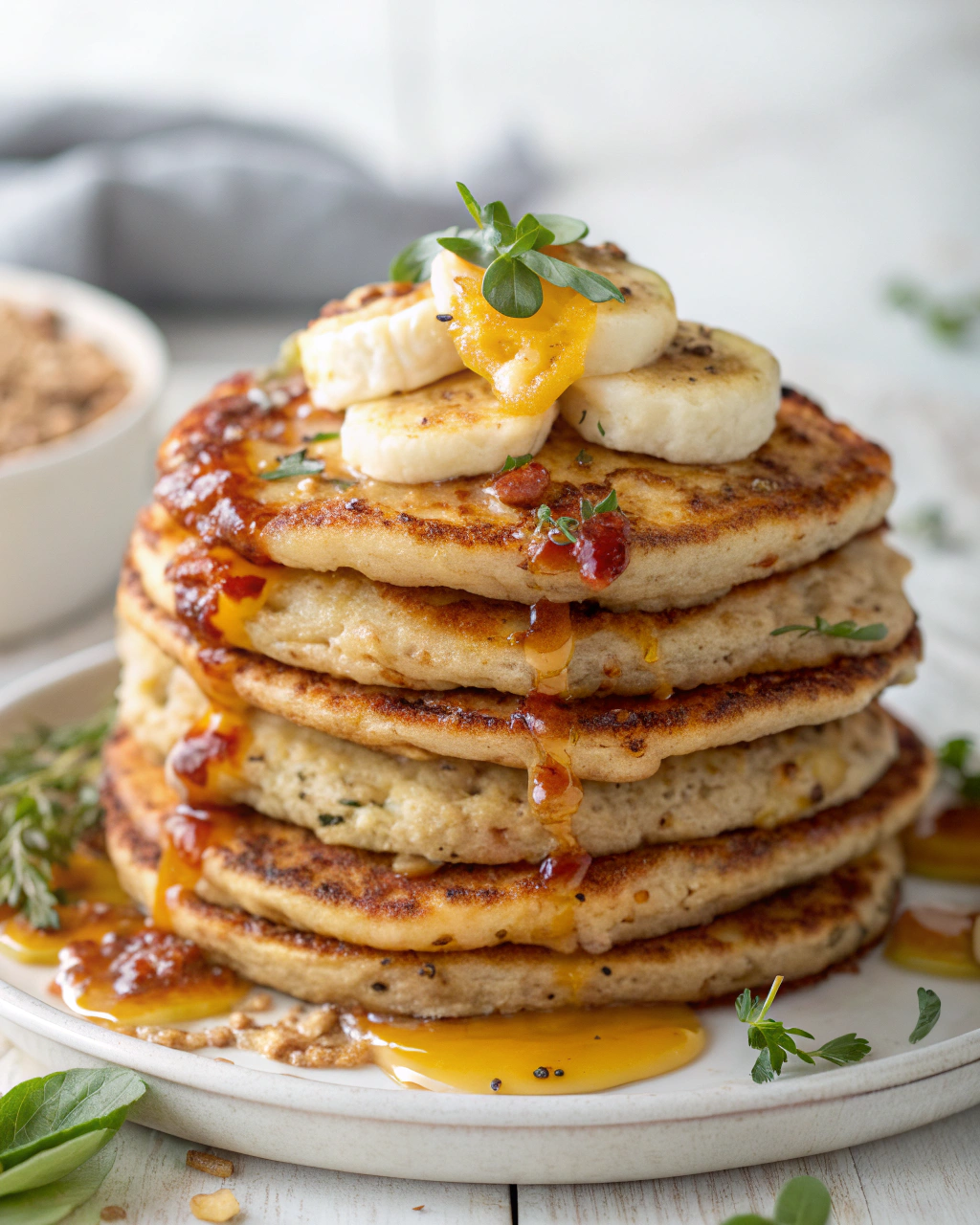 Servez ces pancakes empilés, nappés d’un filet de miel ou d’un peu de sirop d’érable. Quelques quartiers de fruits frais comme des baies ou des rondelles de kiwi ajoutent une touche acidulée et colorée qui contraste avec la douceur de la banane. Un petit pot de yaourt nature à côté offre une note fraîche et légère qui complète bien le côté protéiné de la recette. Ces petits gestes simples rendent l’assiette plus chaleureuse et invitent à s’installer sans hâte autour de la table.