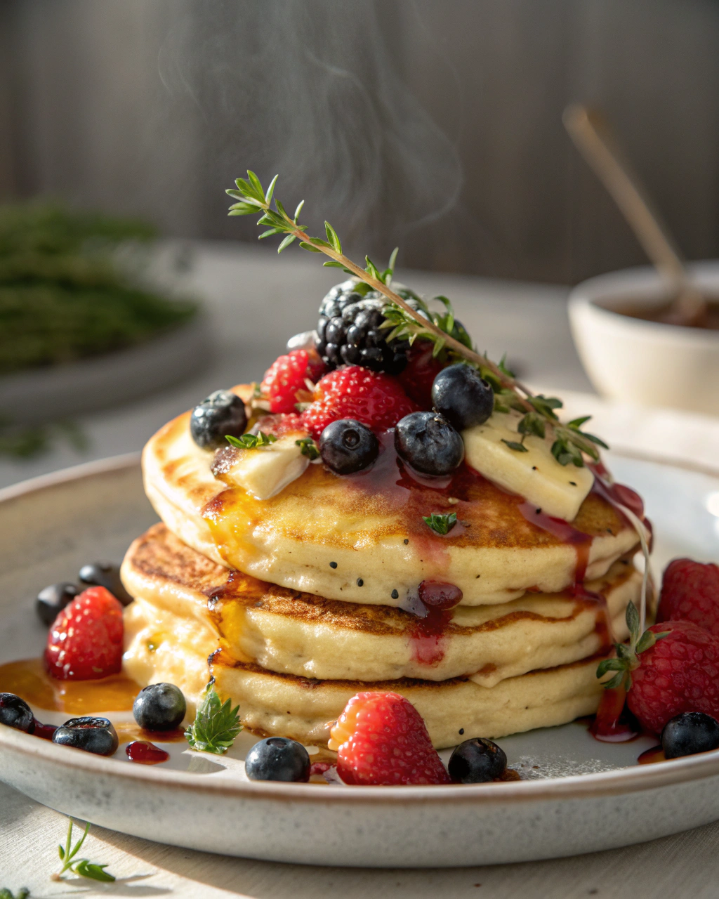 Servez ces pancakes encore tièdes, empilés avec quelques morceaux de beurre fondant qui coulent doucement sur chaque couche. Un filet de sirop d’érable ou une compotée de fruits frais apportera une fraîcheur qui tranche avec la douceur de la pâte. Posez-les sur une assiette simple, ajoutez une tasse de thé ou de café fumant à côté, et laissez l’ambiance se faire naturellement, entre lumière douce et conversations tranquilles. C’est cette simplicité qui rend ce moment vraiment réconfortant.