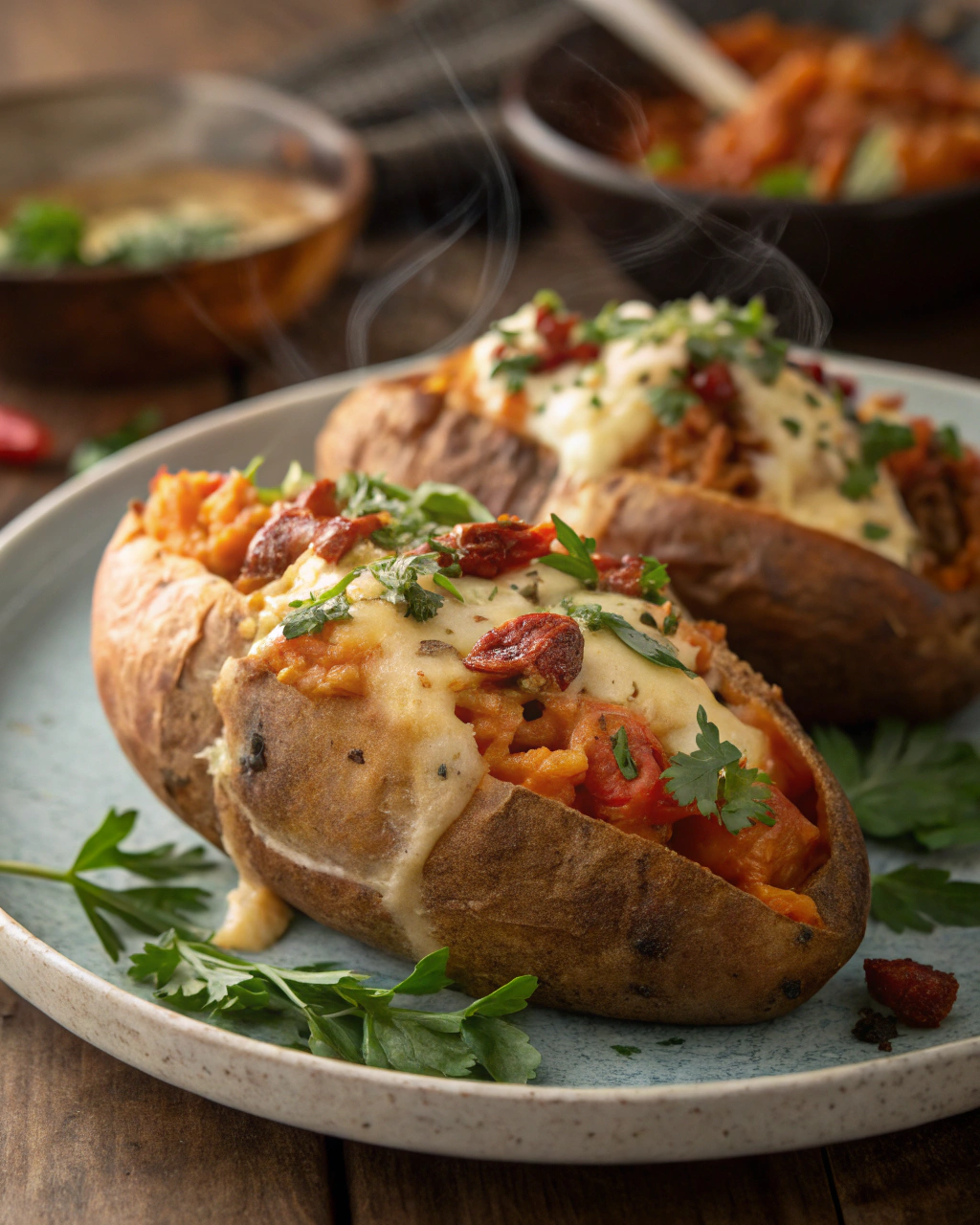 La douceur de la patate douce cuite au four se combine harmonieusement avec la texture crémeuse du houmous. Dès l’ouverture, une légère odeur sucrée s’échappe et laisse entrevoir une chair tendre et chaude. Ce plat simple crée une ambiance conviviale, équilibrée et réconfortante, idéale pour un repas sain à préparer sans effort.