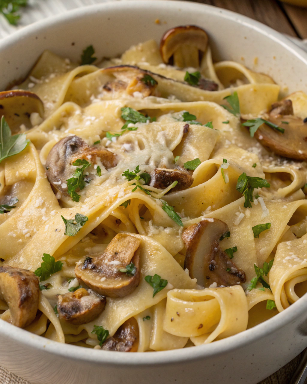 Servez ces pâtes dans des assiettes creuses aux teintes douces, le contraste entre le beige clair des pâtes et le brun des champignons souligne la simplicité du plat. Un joli bouquet de persil frais apporte une nuance de vert délicate et rafraîchit l’ensemble. Accompagnez d’un pain croustillant ou d’une salade verte légèrement vinaigrée pour apporter un peu de vivacité. L’occasion parfaite pour partager un moment tranquille autour d’un repas sans prétention mais sincère.