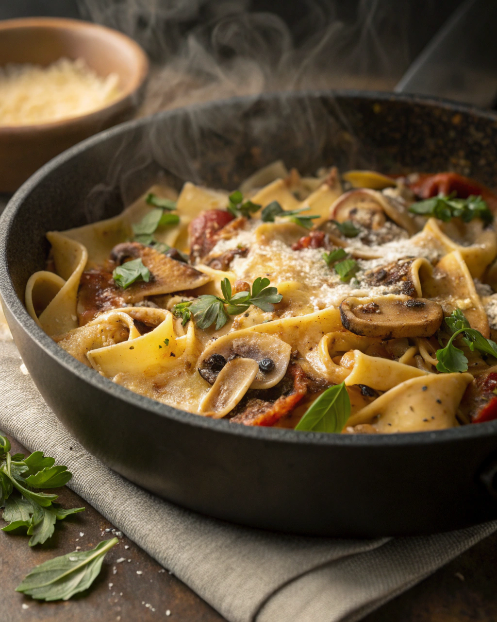 Servez ces pâtes dans des assiettes creuses, en laissant apparaître le velouté de la sauce et les tranches généreuses de champignons. Un peu de persil frais ciselé sur le dessus va illuminer le plat, apportant de la couleur et une petite touche de fraîcheur. Accompagnez d’un pain de campagne légèrement grillé, idéal pour saucer et prolonger ce moment simple. Autour de la table, la lumière douce crée une ambiance paisible, parfaite pour savourer chaque bouchée.