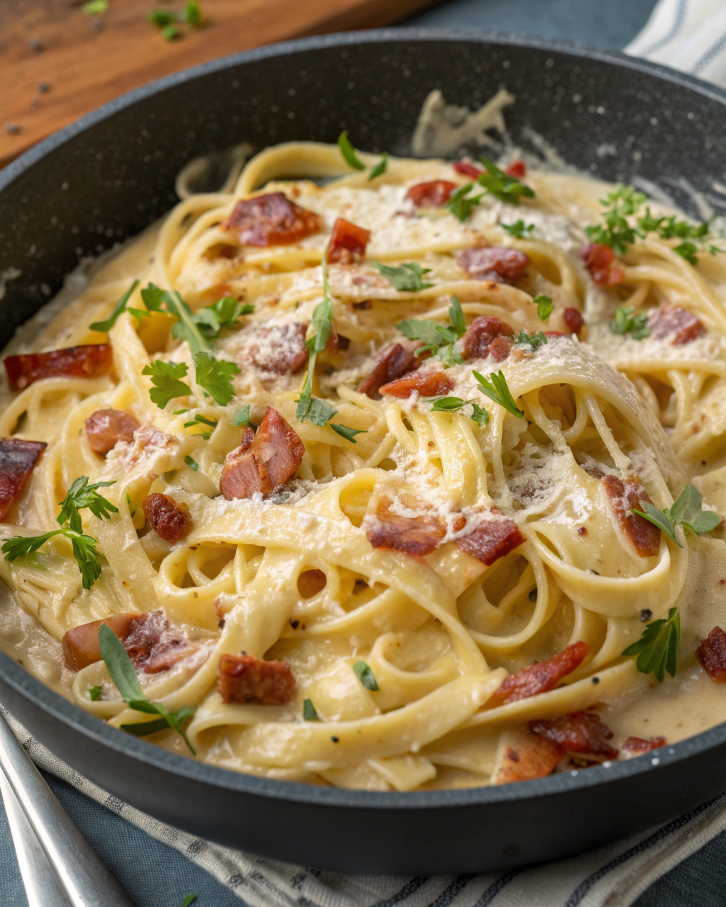 Je me souviens encore de ce jour où, après une longue balade sous une bruine fine, j’ai voulu retrouver un peu de chaleur et de réconfort dans ma cuisine. Le doux crépitement du lard dans la poêle qui commence à dorer lentement, l’odeur fumée qui emplit l’air, c’est ce moment précis qui me fait toujours revenir à cette recette. Quand les pâtes bouillantes rencontrent la sauce onctueuse aux œufs et au parmesan, tout s’assemble comme une caresse. La texture moelleuse et le léger croquant des morceaux de pancetta me parlent d’un équilibre parfait entre simplicité et gourmandise. Sans prétention, juste le plaisir d’un plat qui se prépare vite et qui réchauffe au cœur, un peu comme un dimanche midi chez des amis où tout est simple et bon.