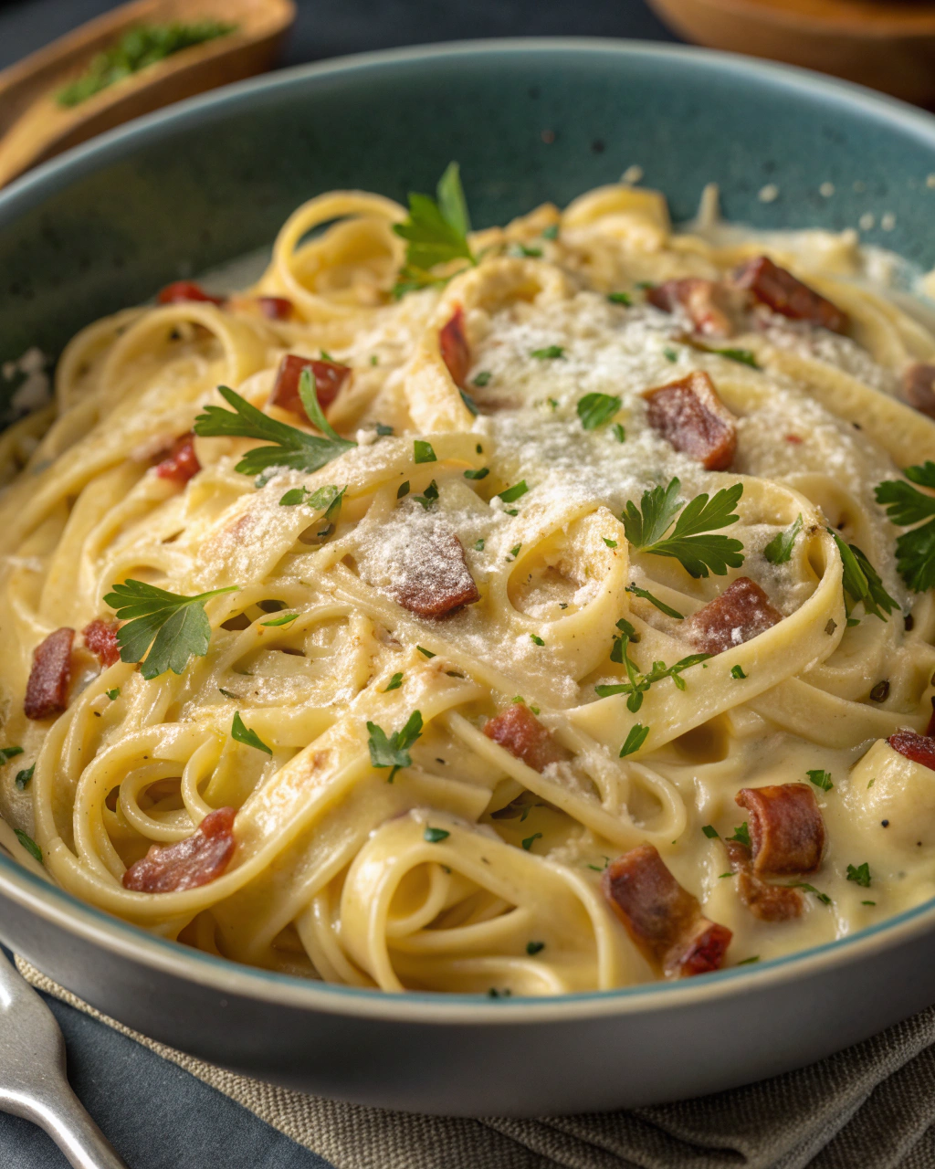 Je me souviens encore de cette odeur chaleureuse qui flottait dans ma cuisine un soir de semaine – le parfum du lard légèrement croustillant se mêlant à celui du beurre doucement fondu, tandis que l’eau bouillonnante chantait son tempo régulier. Le crépitement des morceaux de pancetta dans la poêle, le geste précis mais détendu pour verser les œufs battus dans la sauce encore chaude, tout ça crée une atmosphère simple et rassurante. C’est dans ces moments-là, quand la sauce enrobe lentement les pâtes al dente, que la cuisine devient une pause vraie, presque méditative. La texture soyeuse qui enveloppe délicatement chaque tagliatelle, la pointe de fromage qui fond doucement dans la douceur du mélange, tout cela est une petite tendresse à chaque cuillerée. Ce plat, à la fois humble et réconfortant, est devenu pour moi un souvenir précieux d’instants partagés et de simplicité bienheureuse.