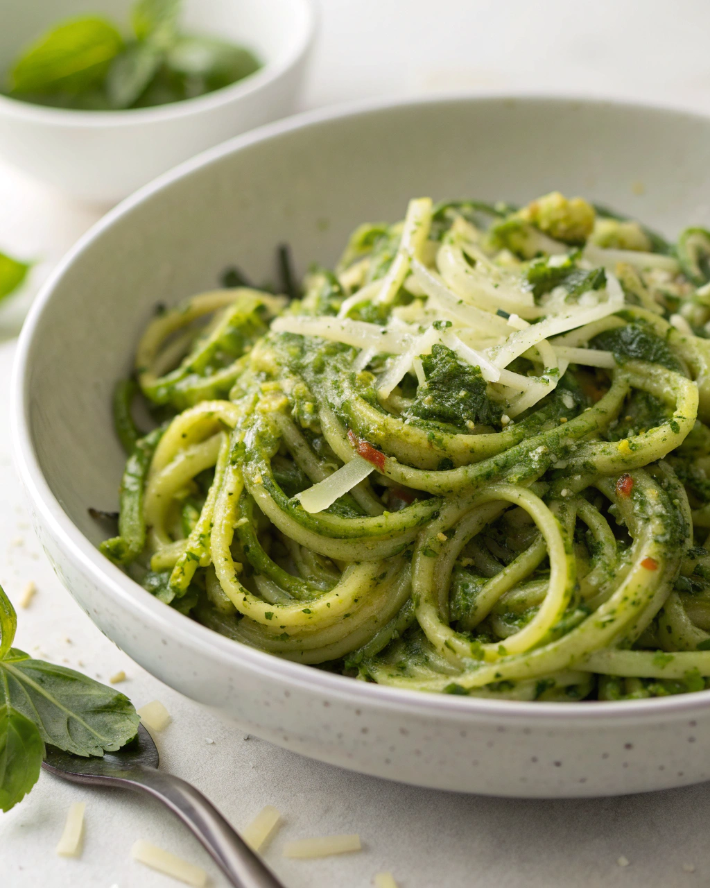 Déposez vos pâtes de courgettes au pesto dans une assiette aux bords larges pour laisser respirer le plat. L’intense vert du basilic contraste joliment avec la douce transparence des courgettes, tandis que quelques éclats de parmesan apportent une touche de lumière. Cette recette s’accommode bien d’un verre de vin blanc léger ou simplement d’une eau citronnée fraîche. En accompagnement, une petite salade croquante ou un filet de poisson grillé complèteraient à merveille ce moment simple et naturel.