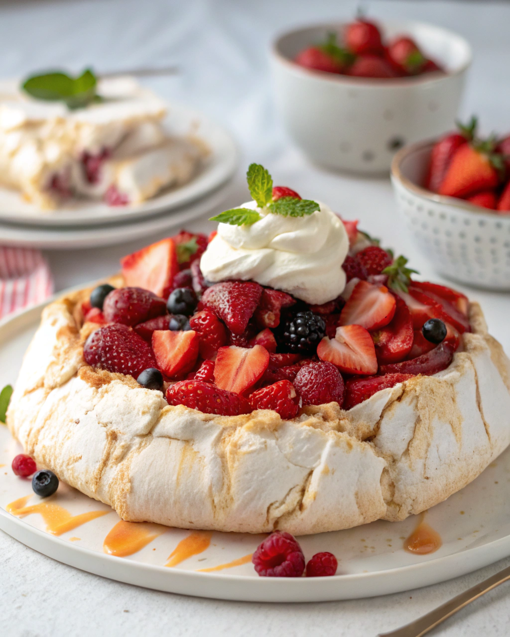 8. Juste avant de servir, déposez la chantilly au centre de la pavlova, parsemez généreusement de fruits rouges, et ajoutez quelques feuilles de menthe pour la fraîcheur et la couleur. Servez sans attendre pour garder tout le croustillant.