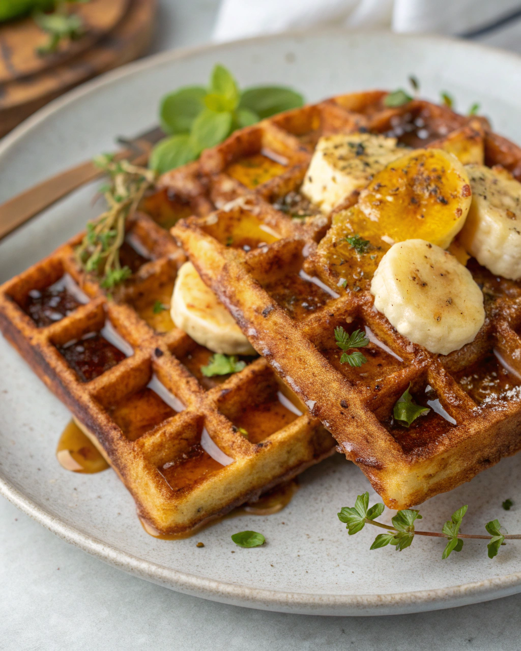 Servir les gaufres tièdes avec un filet de sirop d’érable, une cuillère de yaourt ou quelques fruits frais. Une poignée de noisettes grillées ou un peu de noix de coco râpée mettra en valeur la douceur de la banane.