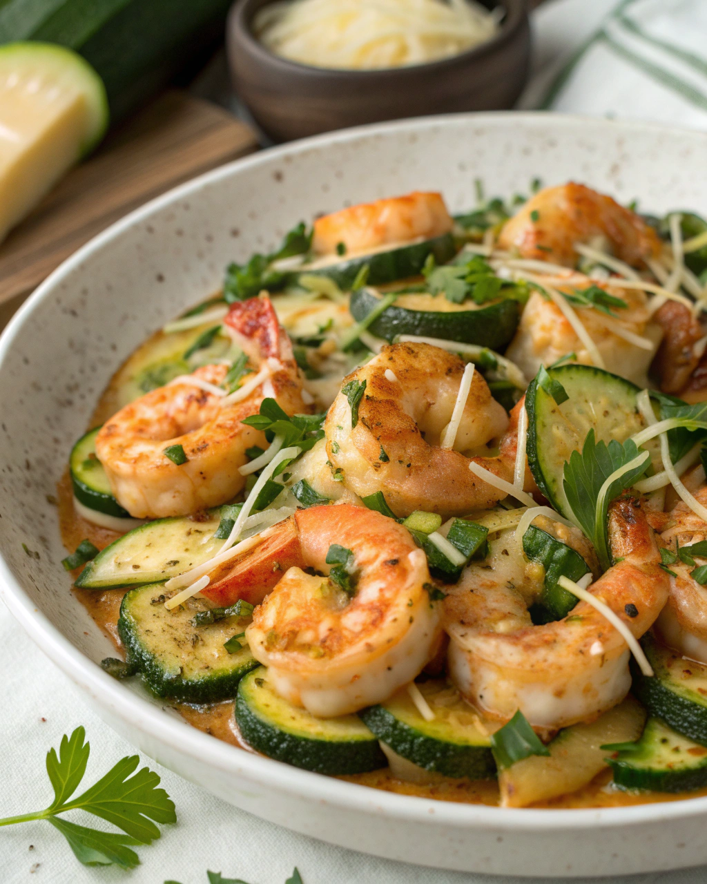 Servez cette poêlée dans des assiettes creuses, là où prennent place les couleurs douces des courgettes vert tendre et le rose délicat des crevettes. Un léger voile de persil frais donne ce petit éclat printanier. Ce plat délicieux se marie bien avec un riz complet, du quinoa ou même du boulgour, pour un dîner complet et équilibré. Autour, une lumière douce, une nappe sobre : la simplicité de l’instant est déjà un plaisir.