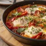 Servez cette poêlée dans des assiettes où les couleurs se répondent joliment : le vert lumineux du haricot, le rouge vif du poivron et le doré des pommes de terre. Elle accompagne merveilleusement bien un poisson grillé ou un œuf poché pour un repas léger. Autour, une petite salade de roquette ou un filet de jus de citron apportent un contraste frais et acidulé qui équilibre le plat. On peut aussi poser cette poêlée comme un lit chaleureux pour une volaille rôtie, offrant un contrepoint doux et nourrissant.
