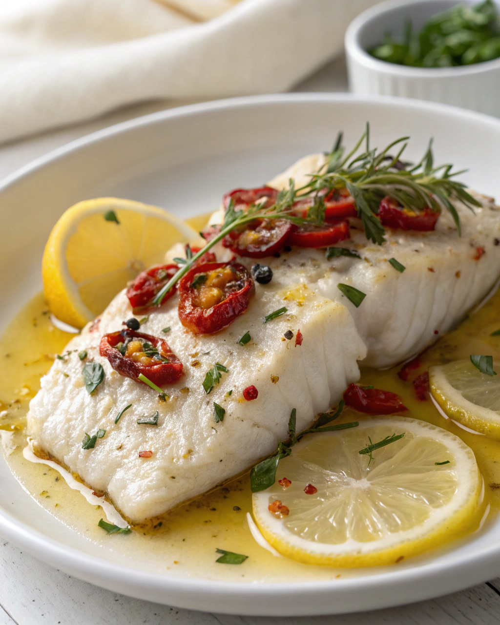 Servez ce poisson blanc juste nappé d’un filet d’huile d’olive, accompagné de quelques zestes de citron pour la couleur et le pep’s. Un brin de persil frais posé en dernière touche ajoutera une nuance verte et lumineuse. La simplicité du plat invite à un repas sans fioritures, où les saveurs se savourent en douceur, de préférence dans une ambiance calme et généreuse, avec un verre d’eau fraîche ou une tisane apaisante.