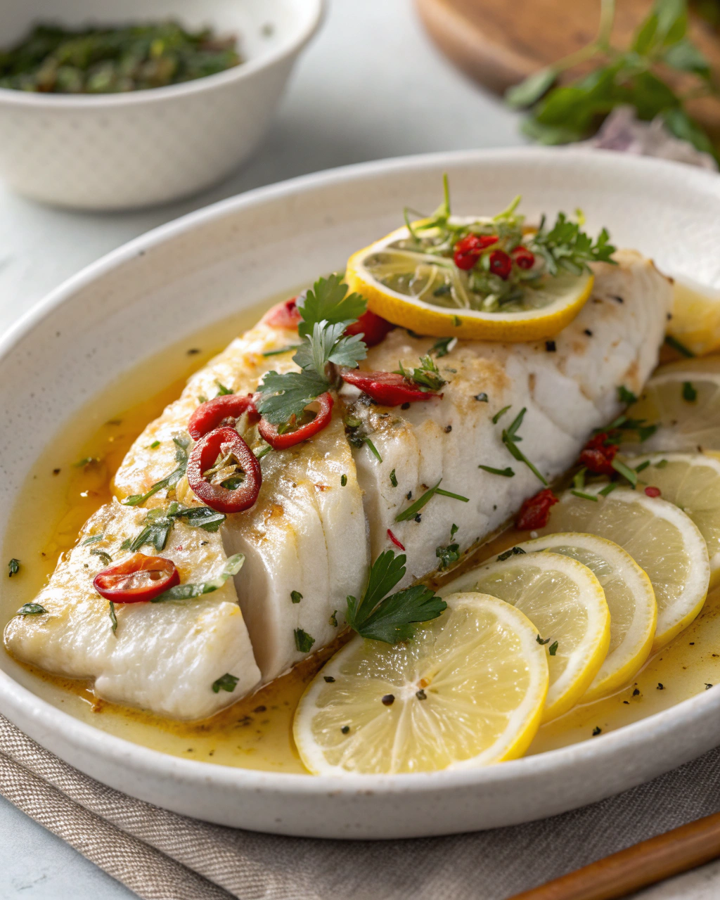 Servez ce poisson blanc vapeur sur une assiette claire, laissé dans sa simplicité. Quelques petits quartiers de citron à côté apportent un éclat coloré et invitent à doser l’acidité selon son envie. Si vous aimez la nature, un lit de jeunes pousses d’épinard ou une poignée de riz basmati compléteront magnifiquement cette préparation douce et lumineuse. Le tout respire la légèreté, à savourer en connaisseur, dans une ambiance calme et apaisée.