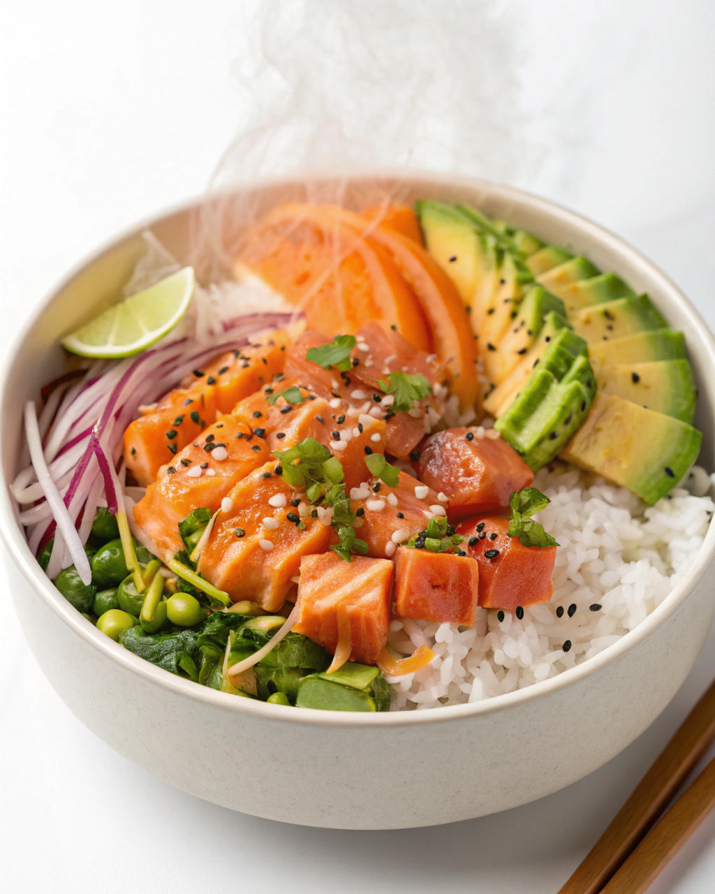 Servez ce poke bowl dans des bols larges qui laissent place aux couleurs et aux textures contrastées — le vert tendre de l’avocat, l’orange doux de la carotte, le rose subtil du saumon. L’association visuelle invite à prendre le temps de savourer chaque bouchée. Accompagnez-le d’une tisane fraîche à la menthe ou d’un thé léger, et laissez la simplicité du plat réchauffer doucement un moment de pause au milieu de la journée.